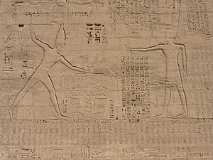 Rilievo raffigurante Ramses III che stermina dei nemici, assistito dal dio Amon, dalle pareti del suo tempio funerario a