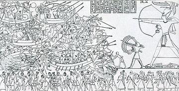 Ugarit, devastato la Palestina e occupato Cipro, invasero l'Egitto sia via terra che via mare. Ramses III li sconfisse in due grandi battaglie,
