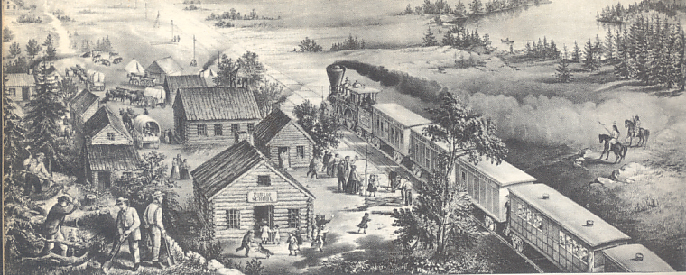 Sopra: la Union Pacific Railroad intorno al 1870: notare la linea telegrafica e i carri merci.