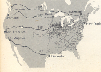 Sopra: le linee sottili rappresentano le linee ferroviarie esistenti nell'America Settentrionali nel 1870, quelle spesse le ferrovie transcontinentali: la Canadian Pacific (terminata nel 1885), la North Pacific (1883), la Union Pacific (1869) e la South Pacific (1883).