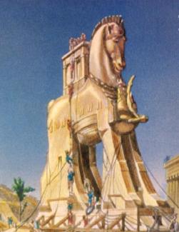 Sotto: ricostruzione del cavallo di Troia