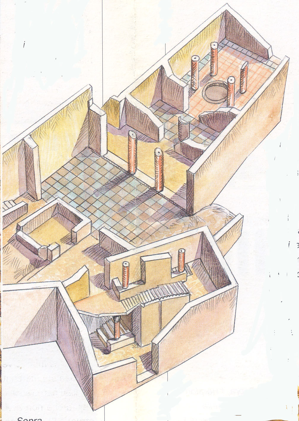sotto: il mègaron, la grande sala al centro della