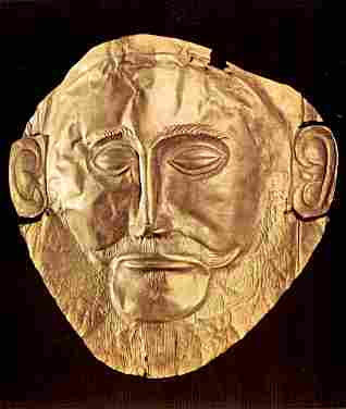 Maschera d'oro battuta trovata in una tomba sotterranea di Micene. Schliemann riteneva fosse di