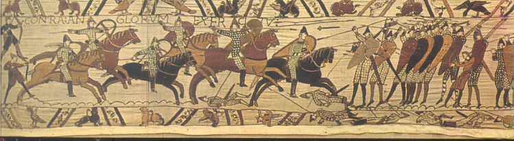 Sopra e sotto: narrazione di alcuni episodi dell'invasione normanna dell'Inghilterra avvenuta nel 1066 riportati su un arazzo del XI secolo. Sopra lo sbarco a Pevensey (Inghilterra meridionale). Sotto: battaglia di Hastings nella quale il re Astolfo trovò la morte a causa di una freccia nell'occhio.