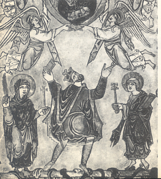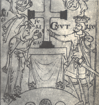 Sopra: re Canuto e la regina Aelgifu sistemano una croce su un altare.