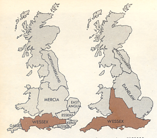 a destra: la divisione del territorio fra Sassoni e Danesi dopo il trattato di Wedmore nell'878. I re sassoni del Wessex governarobo su una Inghilterra unita.