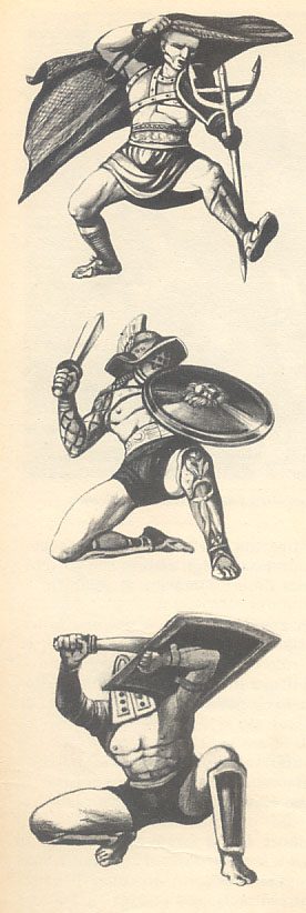 Sotto: gladiatori: reziario, a centro mirmidone, e, infine oplomaco.